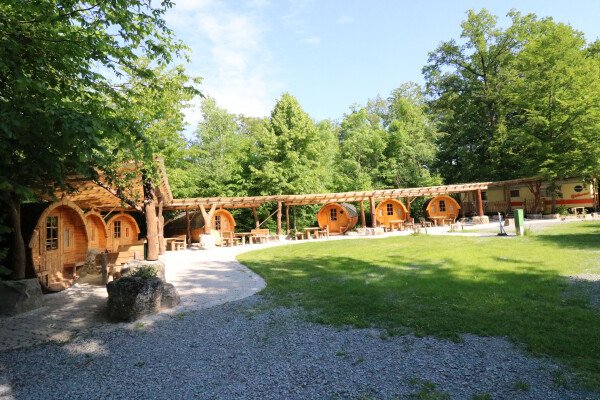 Übernachtung im Campingfass für bis zu 4 Personen. Das Campingfass bietet Beleuchtung, Strom und Heizung.