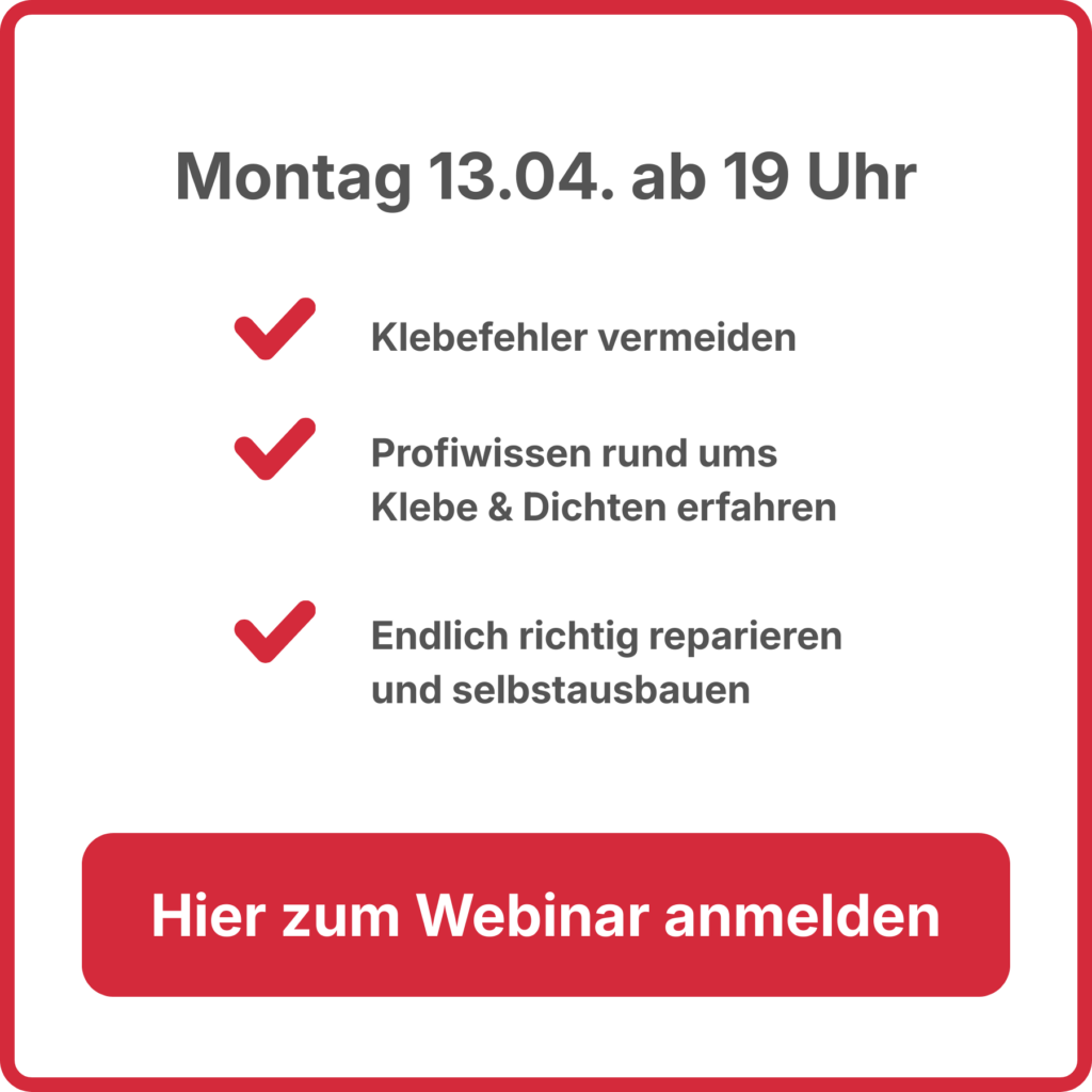 Ob du deinen Campervan, Wohnwagen oder dein Wohnmobil reparierst, Zubehör installierst oder komplett ausbaust – in diesem Webinar lernst du, die richtigen Entscheidungen beim Kleben und Dichten zu treffen. Von der Produktwahl bis zur Anwendung. Kostenlos, verständlich und auf den Punkt.