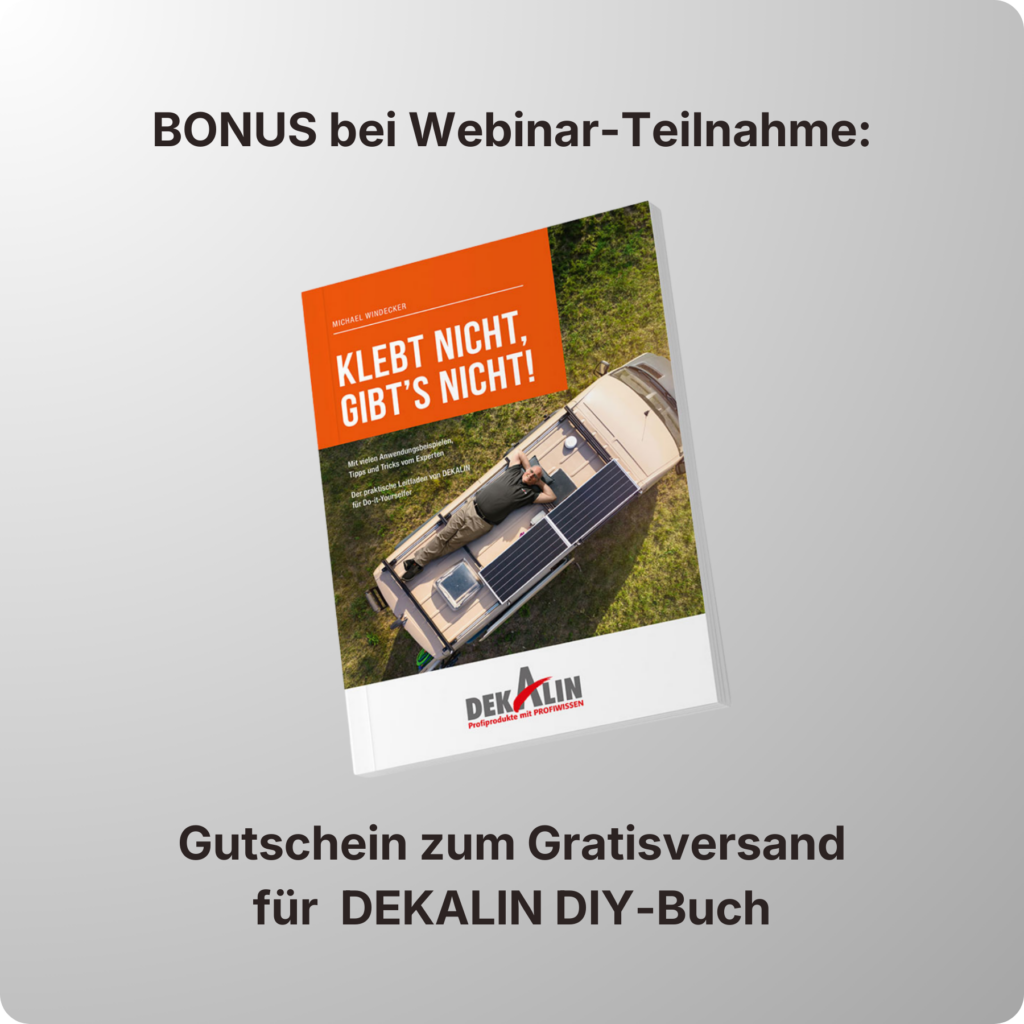 Alle Teilnehmerinnen und Teilnehmer erhalten nach dem Webinar einen exklusiven Gutscheincode für den kostenlosen Versand des DEKALIN-Fachbuchs „Klebt nicht, gibt’s nicht“.
