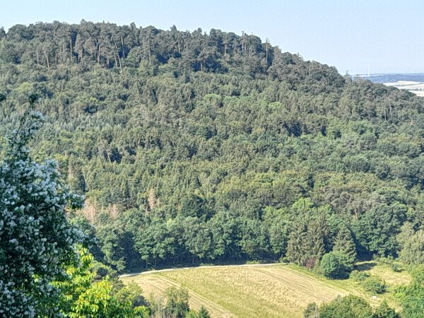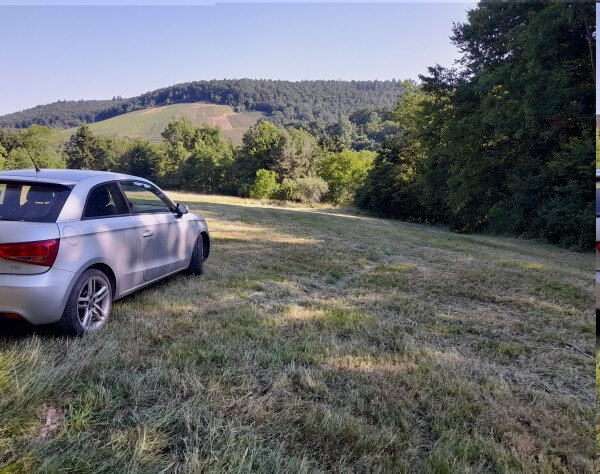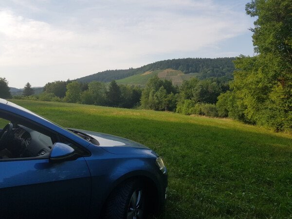 Auf einer Wiese direkt am Waldrand. In nächster Nähe zu schönen Wanderwegen am Waldrand, im Wald, Streuobstwiesen und Weinbergen.