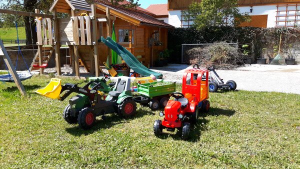 ein Spielplatz mit Trampolin und Fahrzeugen zur Verfügung.