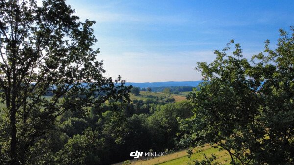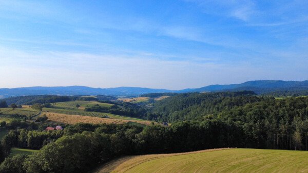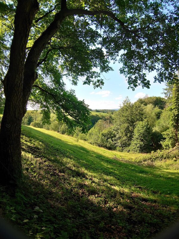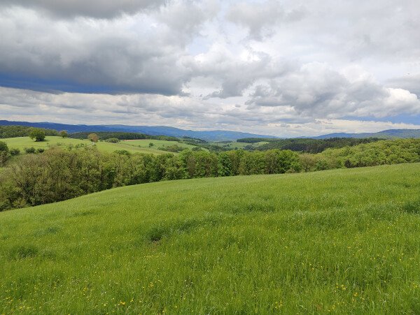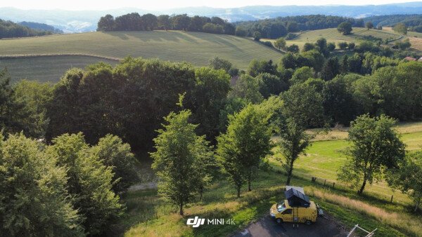 Dein Stellplatz liegt erhöht auf einem ehemaligen Sportplatz, umgeben von Bäumen und mit Blick auf ein sanftes Tal.