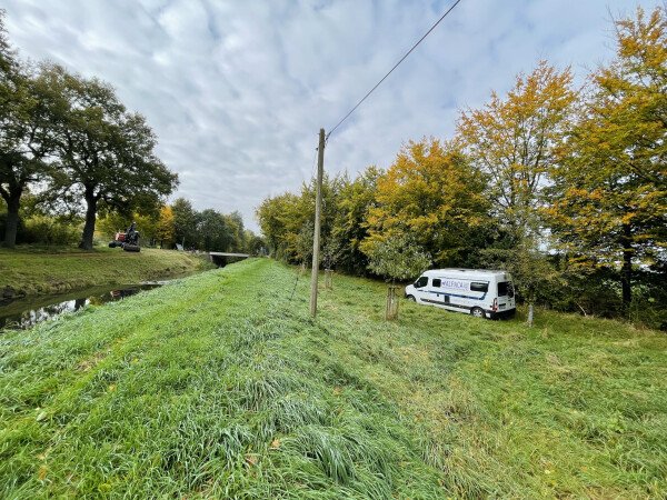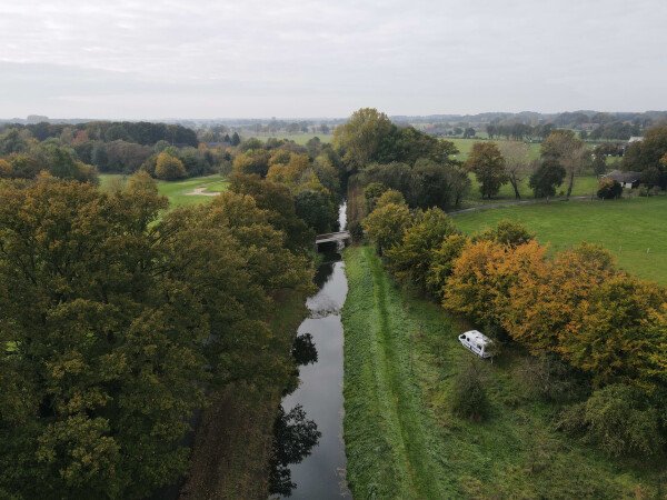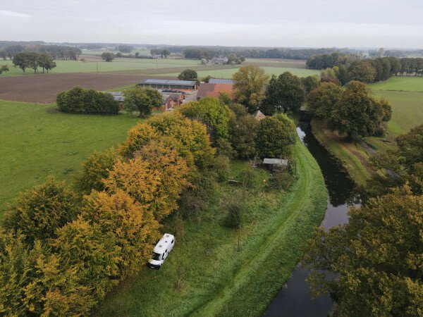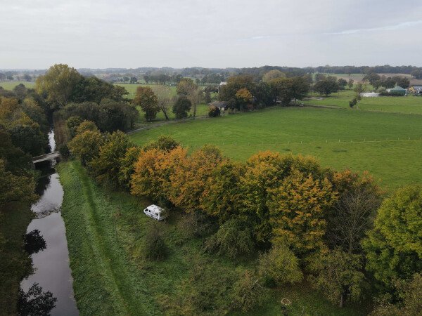 Der ganzjährig nutzbare Stellplatz liegt an der Issel im Ortsteil Brünen der Stadt Hamminkeln an der Grenze zu Schermbeck.