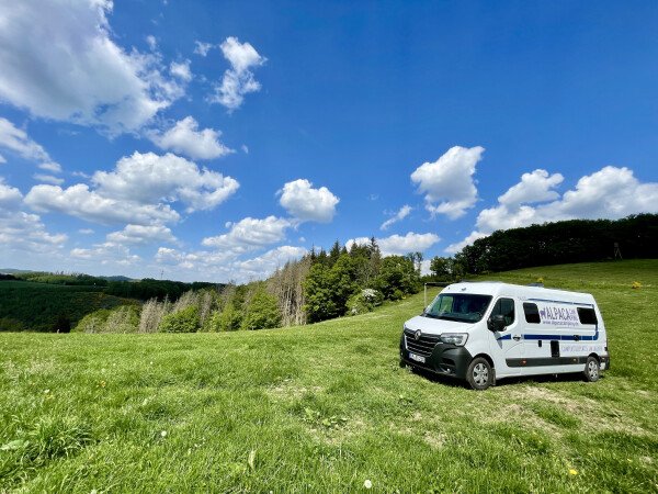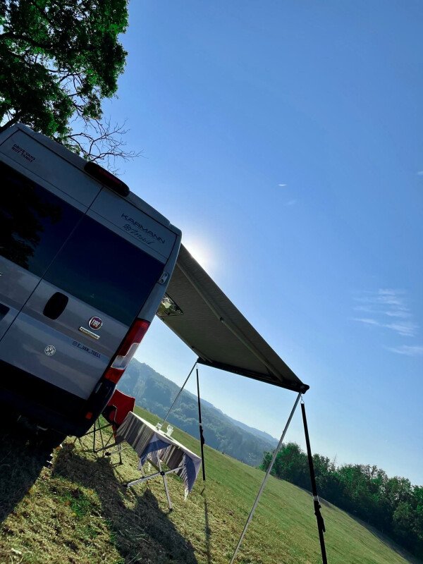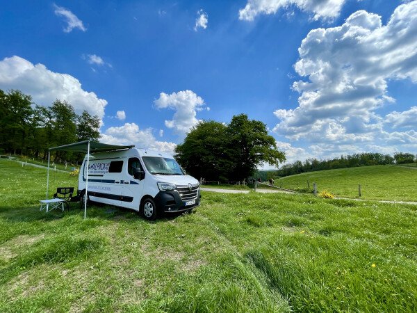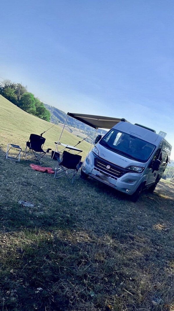 Idyllischer Wohnmobilstellplatz auf einer grünen Wiese mit einem fantastischen Weitblick