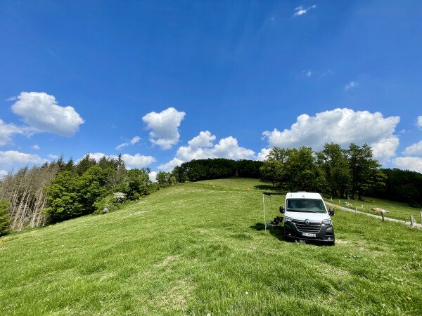 "Auf einer Kleewiese hatte ich auf einer Anhöhe einen formidablen Panoramablick auf ein Tal. Der Vermieter war sehr nett und das Duschbad in einer akzeptablen Entfernung zum Platz. Ich würde den Stellplatz jederzeit wieder in Anspruch nehmen."