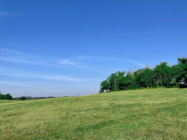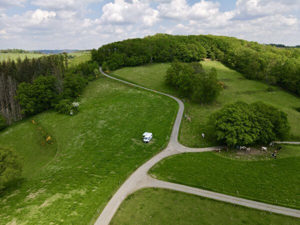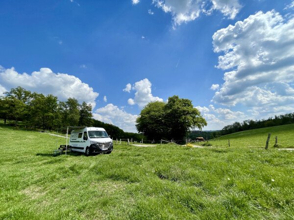 "Ein wunderschöner Stellplatz auf einer leeren Kuhweide mit Weitblick, wir standen oben am Eichenwäldchen wunderbar eben und für uns alleine. Bis auf die Kühe, die zur Nachbarsweide getrieben werden, und ein paar Spaziergänger und Fahrradfahrer kommt unten an der Wiese niemand vorbei. Die Nächte waren wunderbar ruhig.