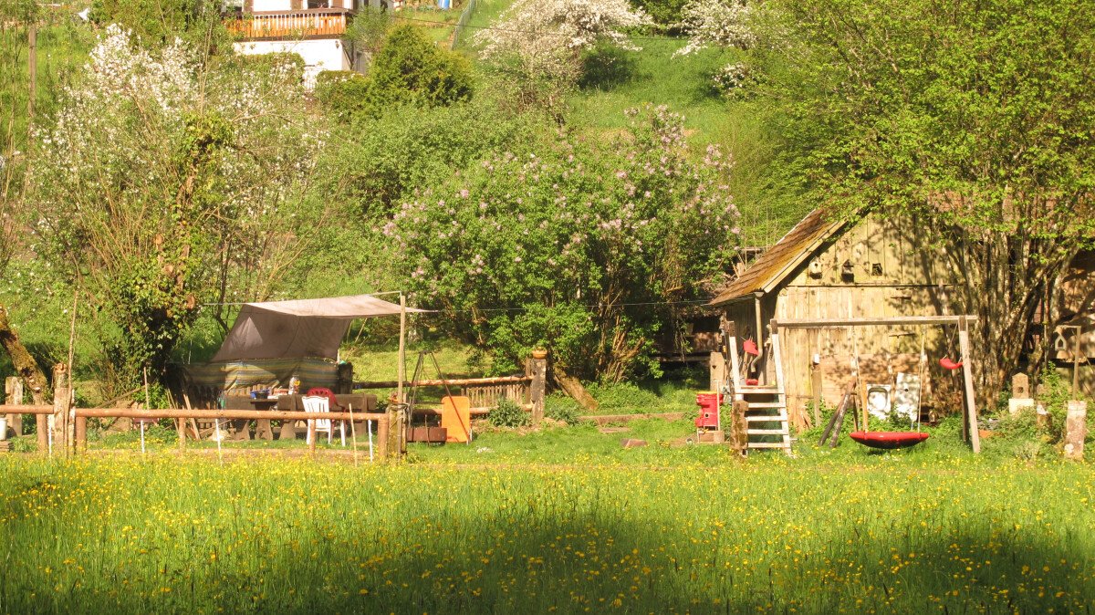 Es ist ein ganz ruhiger Platz, an einem kleinen Bach, umgeben von einer schönen großen Wiese. Für Kinder ist es das reinste Paradies.