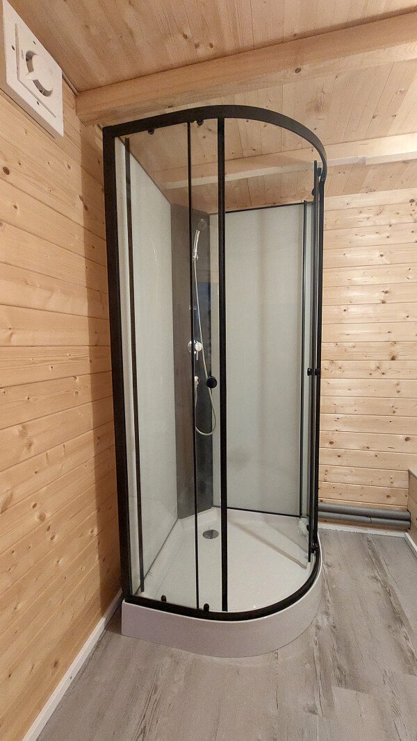 Es ist ein kleines Waschhaus mit Waschbecken, Dusche und Trockentrenntoilette vorhanden.