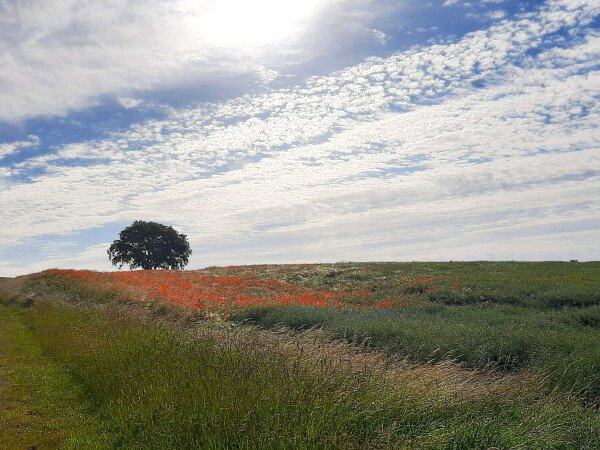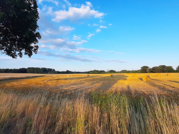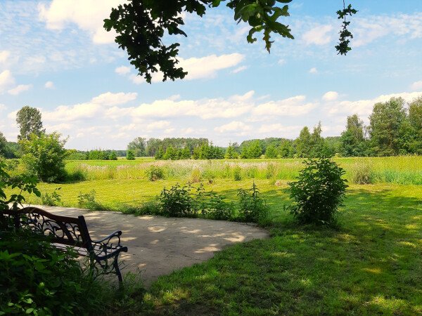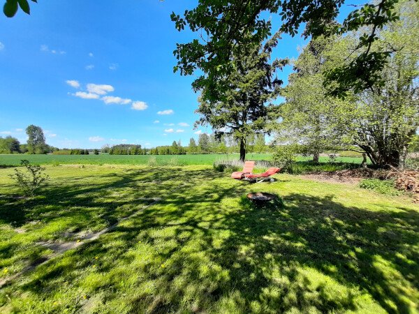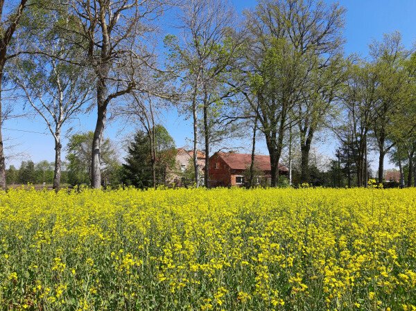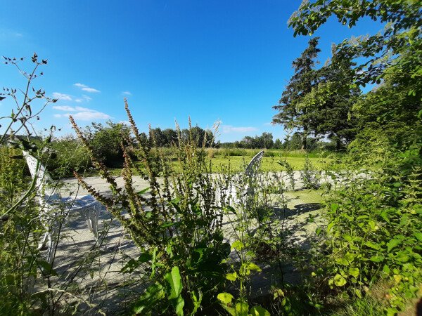 Das Gelände ist an drei Seiten von Feldern umgeben, auf denen sich Störche, Kraniche, Gänse, Schwäne und weiße Reiher, vor allem aber Rehe tummeln, die sich manchmal bis auf unser Grundstück wagen.