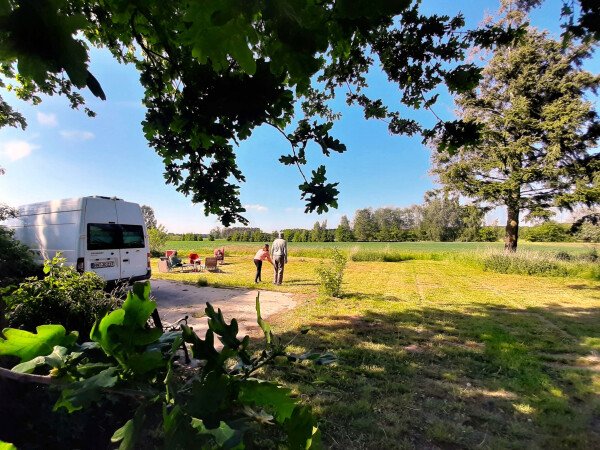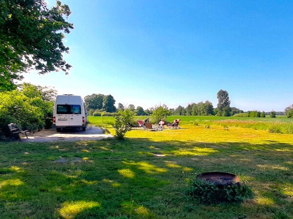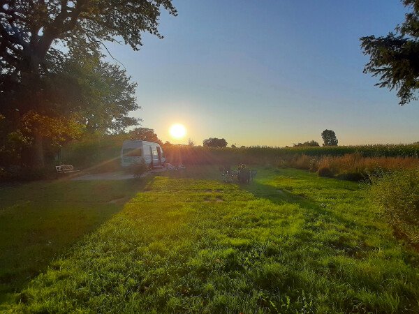 Der weitläufige Stellplatz liegt still im hinteren Teil des Grundstücks mit eigener Wiese, zwischen Sonnenauf- und untergang.
