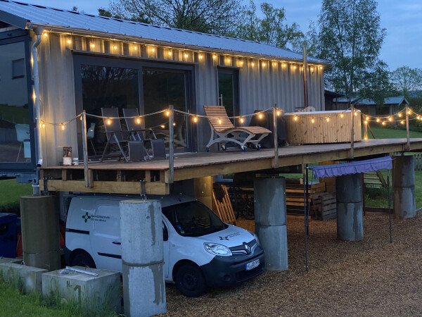 Neben einem modernen See-Container-Haus auf Stelzen kannst du dir auf dem rund 1500 m² großen Grundstück deinen Lieblingsplatz aussuchen – zwischen Wiesen und alten Obstbäumen.
