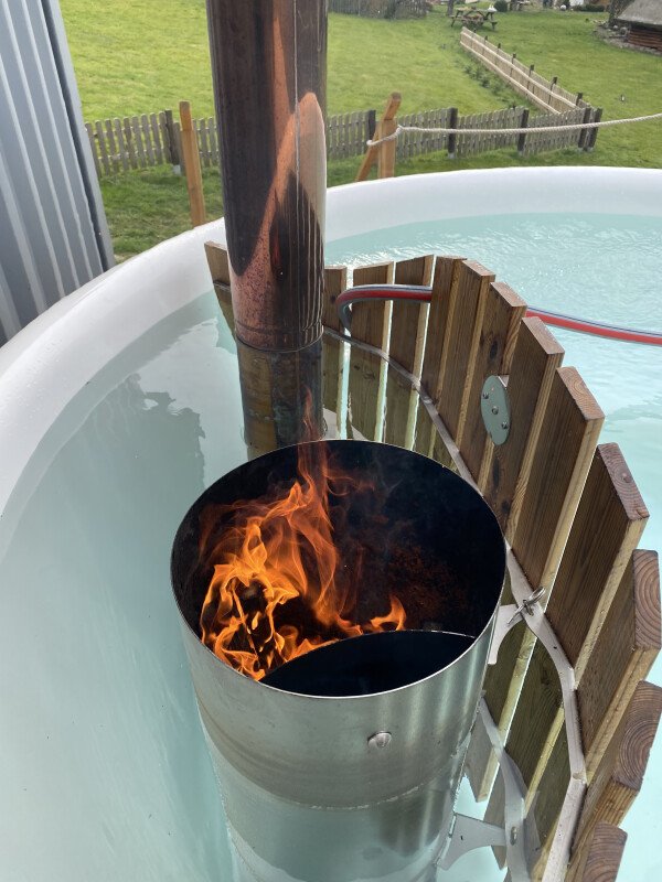 Eine Feuerschale lädt zu Abenden am Lagerfeuer ein, und nach vorheriger Absprache kannst du optional den Hot Tub auf der Terrasse nutzen. Von dort blickst du weit über die Felder und Dörfer – besonders schön bei Sonnenuntergang oder im Winter, wenn du im warmen Wasser sitzt und die Schneeflocken fallen.