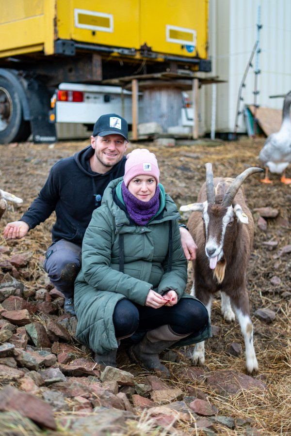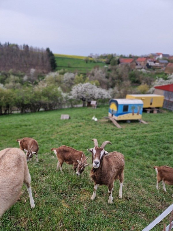Am Stellplatz heißen euch Kathrin und Alex herzlich willkommen – begleitet von unseren tierischen Hofbewohnern: