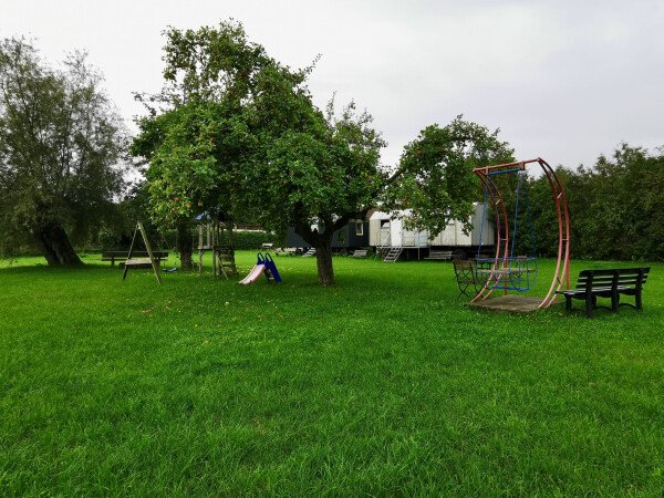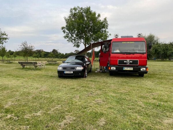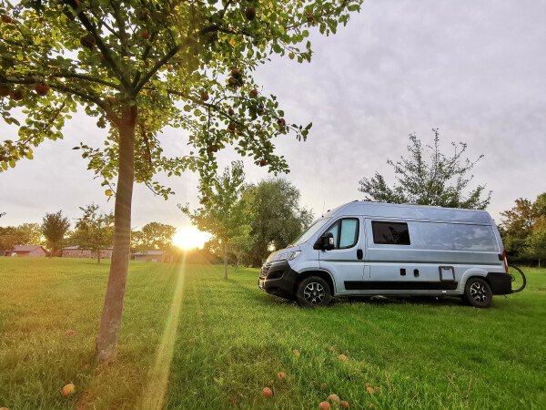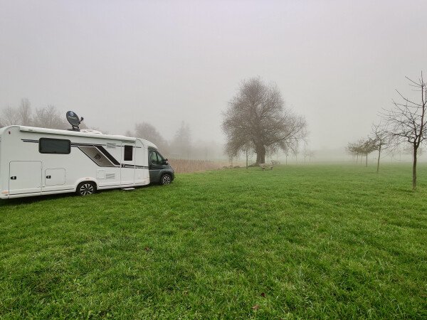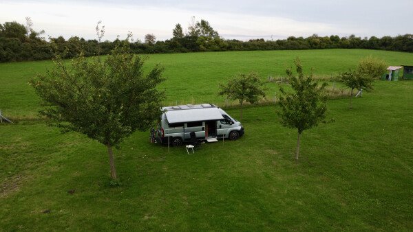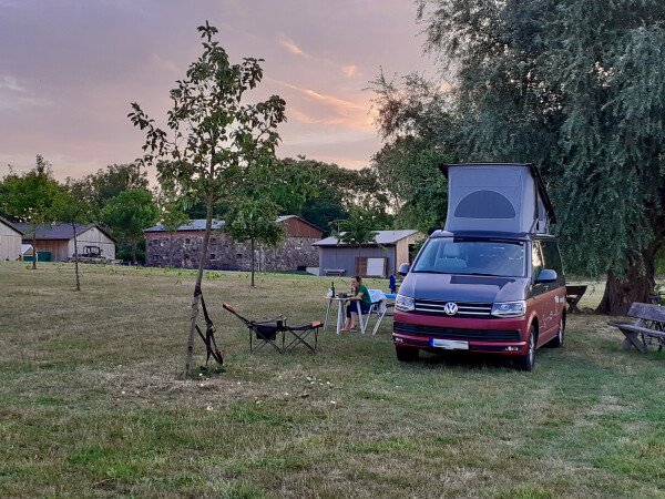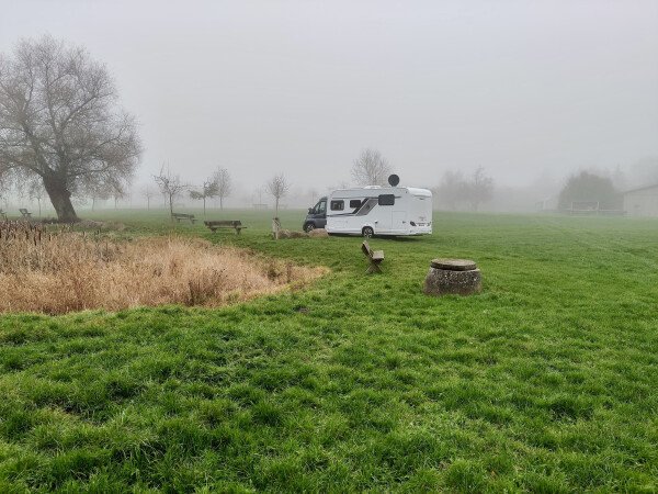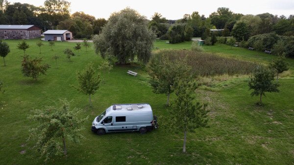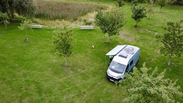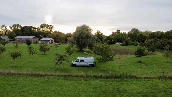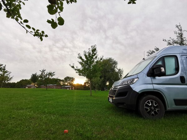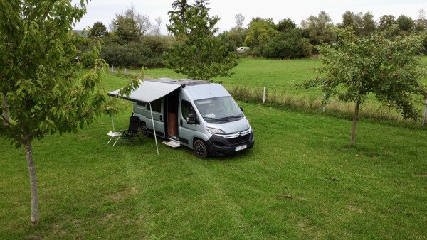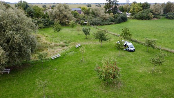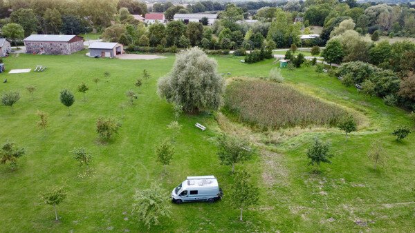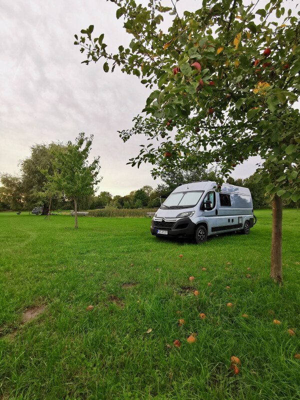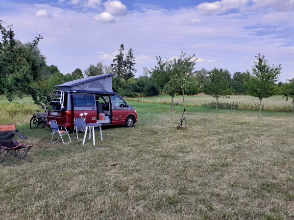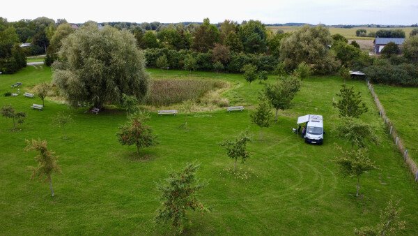 "Toller Stellplatz zwischen Obstbäumen auf einer RIESIGEN Wiese. Wir waren ganz alleine und haben die Ruhe und den Besuch der Storche und Rehe sehr genossen. Toiletten waren sehr sauber. Wichtige Info: Einfahrt beim zweiten Tor und mit etwas Kraft den Riegel umlegen. Haben kurz den Gastgeber angerufen, der direkt rangegangen ist und die Einfahrt beschrieben hat."