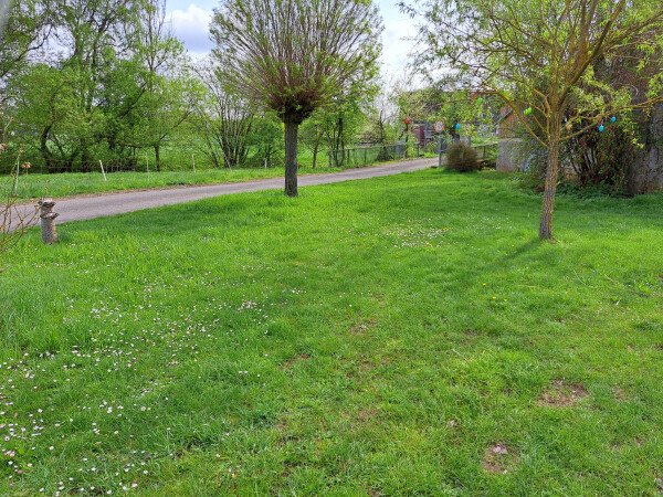 Auf einer ca 100m2 großen Grünfläche könnt ihr stehen. Zwei Bäume spenden etwas Schatten, ebenso das dahinter gelegene Gebäude.