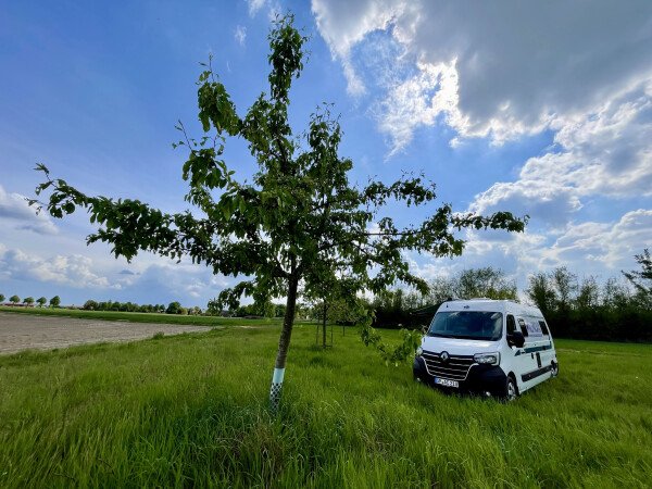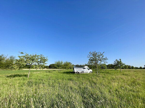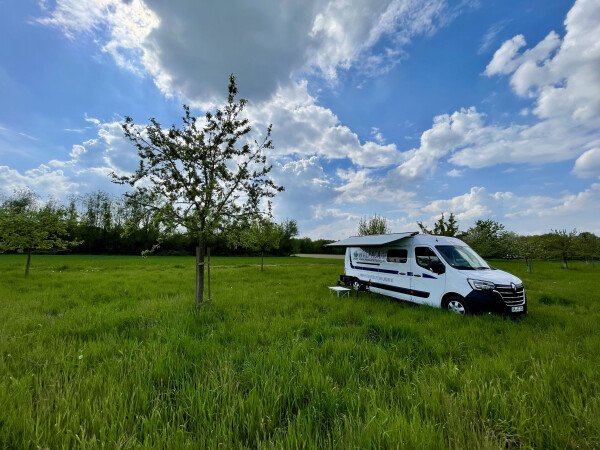 Hübscher Wohnmobilstellplatz auf einer saftig grünen Wiese mit herrlichem Ausblick
