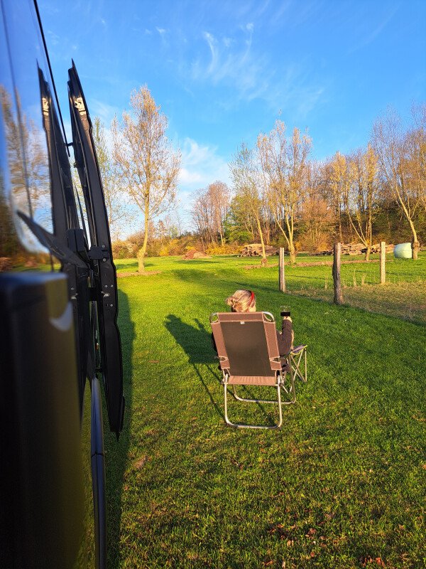 Wenn es mal zu nass sein sollte und euer Allrad mit Abwesenheit glänzt, könnt ihr auf einem befestigten Streifen am Rand der Wiese stehen. Dies empfiehlt sich auch für "Hartgesottene", die uns im Winter besuchen möchten. Die Aussicht bleibt die gleiche, nur die Perspektive verändert sich. ;)