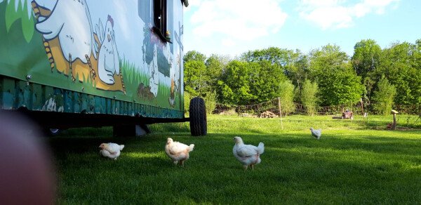 Weil uns Freiheit wichtig ist, haben auch unsere Hühner, Hähnchen und Puten Mobilheime, mit denen sie regelmäßig auf unseren Wiesen weiterziehen. Wer mag, 'kann sein Zelt daneben aufschlagen' und sich morgens vom Hahn wecken lassen. Letztere Stellplatz-Option empfiehlt sich allerdings nicht für Langschläfer. ;)