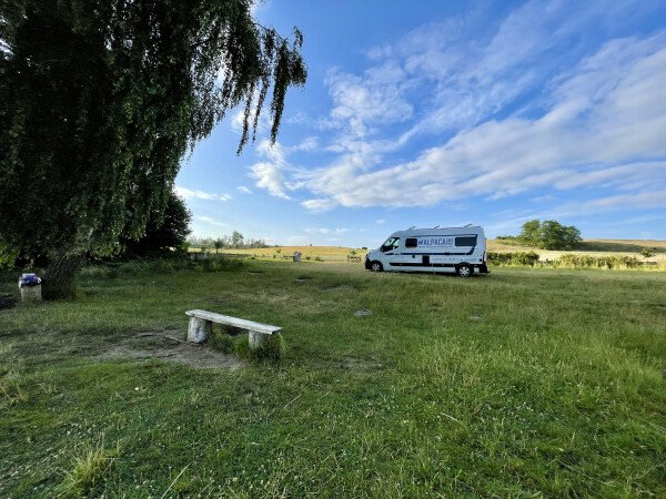 "Wir haben den Platz mit einem anderen Wohnmobil geteilt, das allerdings circa 20 m entfernt war. Leider war ewig nicht mehr gemäht worden, und überall war Brennnessel. Leider konnte man nicht so viel von dem See vom Platz aus sehen. Abends, als die ganzen Menschen am Badestrand alle weg waren, war es sehr idyllisch und schön dort zu sitzen."