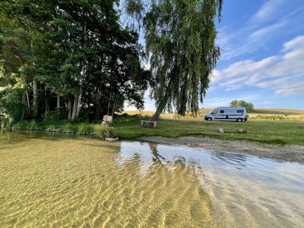"Dieser Platz ist wirklich großartig! Wir fühlten uns wie an einem einsamen See in Schweden! Die Badestelle ist super und da die Wiese recht groß ist, ist genug Platz für Camper und Badegäste vorhanden. Wenn gerade niemand da ist, hört man wirklich nichts: kein Auto, kein Flugzeug... nur Natur!
