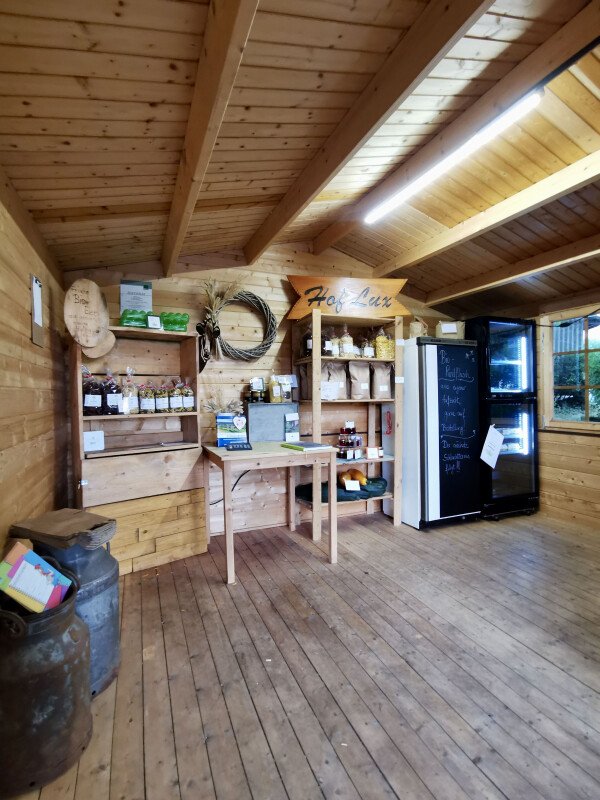 Seit 2021 haben wir einen eigenen Hofladen, dort verkaufen wir selbstproduzierte Produkte wie Eier, Nudeln, Milch, Aufstriche und Rindfleisch aus eigener Aufzucht.