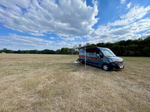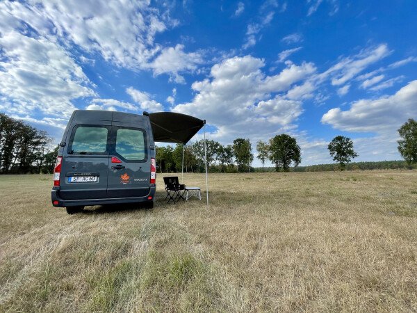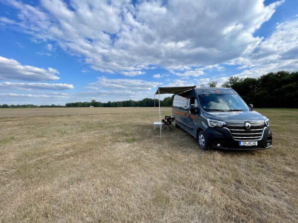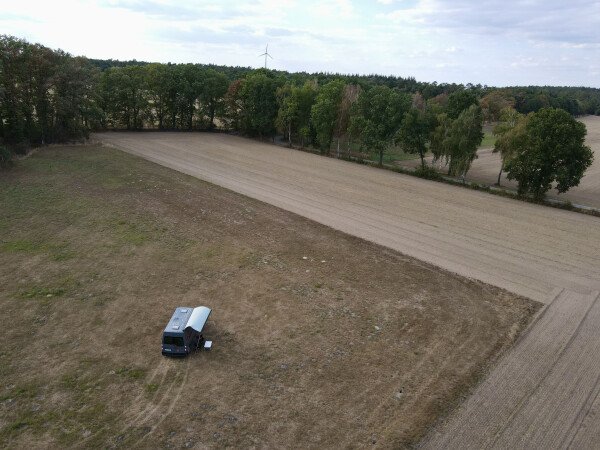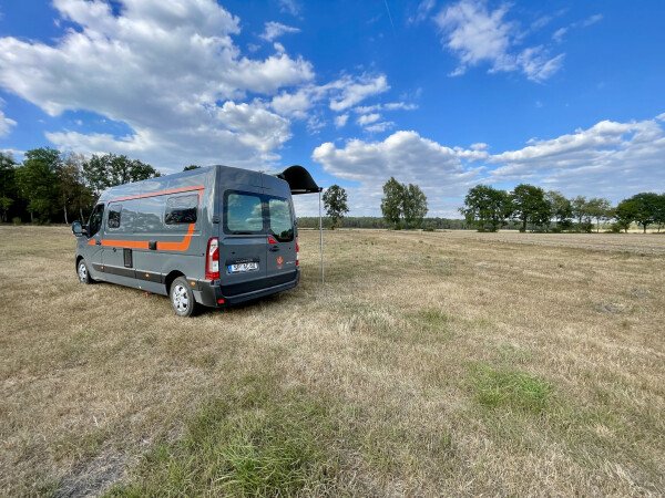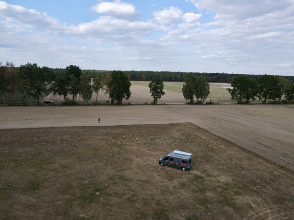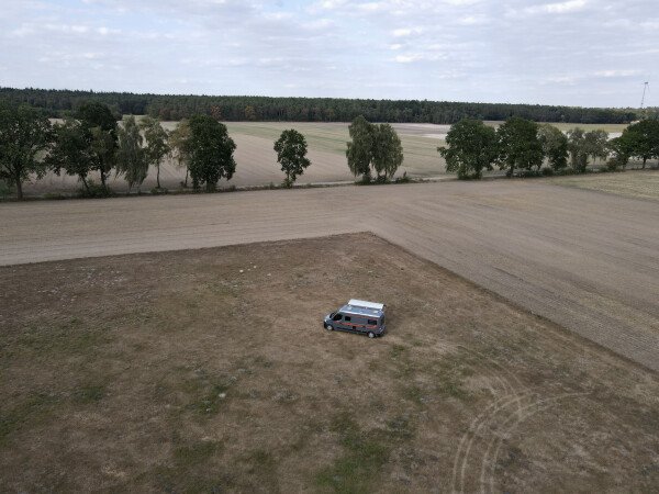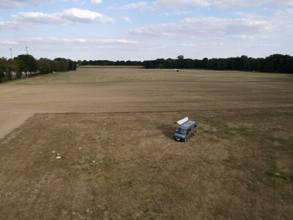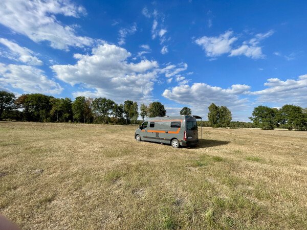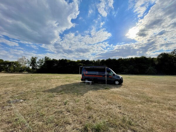 "Der schöne Wiesenboden ist bei Nässe mit Vorsicht zu genießen. Ich habe mich zu jeder Zeit wohl gefühlt, da ich komplett für mich alleine außerhalb der Sichtweite weiterer Gebäude stand. Die Zufahrt erfolgt über einen ca. 1000 Meter langen Betonplattenweg, der die letzten 500 Meter in einen Schotterweg übergeht, bis auf die Wiese. Ich durfte einen sehr netten und unkomplizierten Gastgeber kennenlernen. Der Stellplatz liegt auf einer riesigen Wiese inmitten von Feldern und umgeben von Wald und Bäumen - also mitten in der Natur und super ruhig mit tollem Weitblick. Wer Wert auf gerades Stehen legt, sollte seine Unterlegkeile einpacken. Einkaufsmöglichkeiten für den täglichen Bedarf gibt es in ca. 3 Kilometer Entfernung.