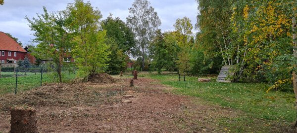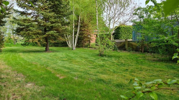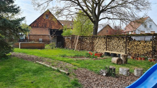 Wir wohnen auf der anderen Straßenseite und nutzen das 1400 m² Grundstück zum Teil als Gemüsegarten und Spielplatz.