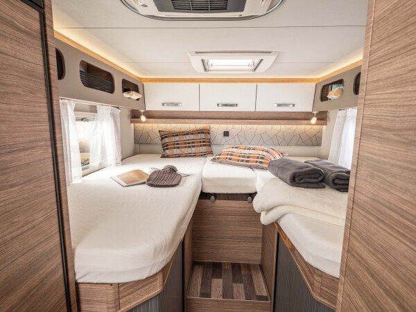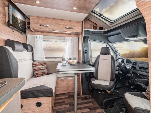 Durch das Hubbett entfällt bei unserem Wohnmobil der sonst bei Familienmobilen übliche Alkoven-Aufbau über der Fahrerkabine, das spart Gewicht und Kraftstoff und macht das Mobil kompakter für enge Durchfahrten.