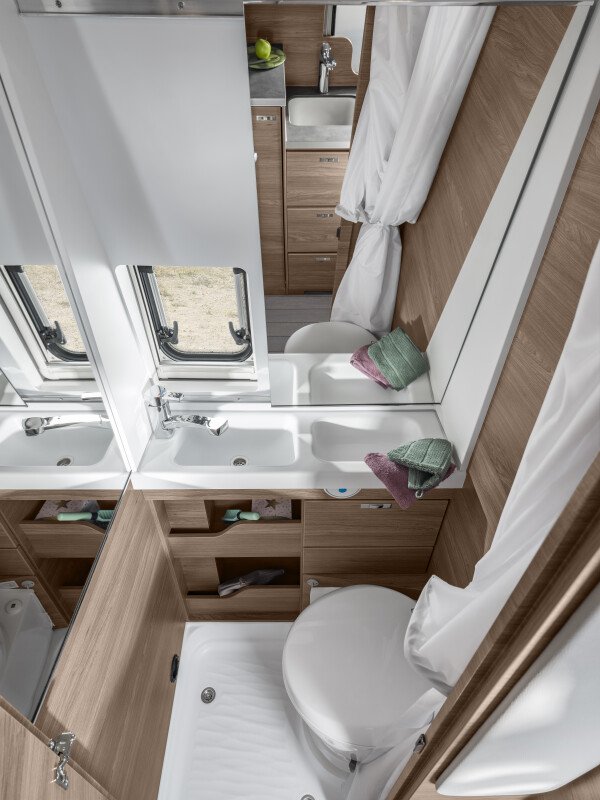 Toilettenraum mit Waschbecken und Dusche, Dometic Keramik-Kassetten-Toilette mit elektrischer Pumpe, Spiegelschrank, Dachlüfter mit Moskitoschutz, Versenkte Halogenbeleuchtung