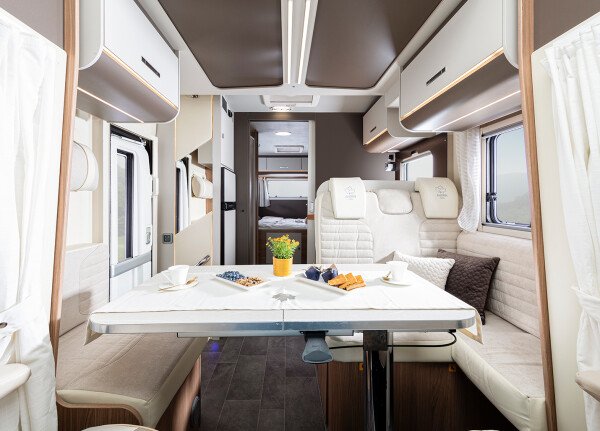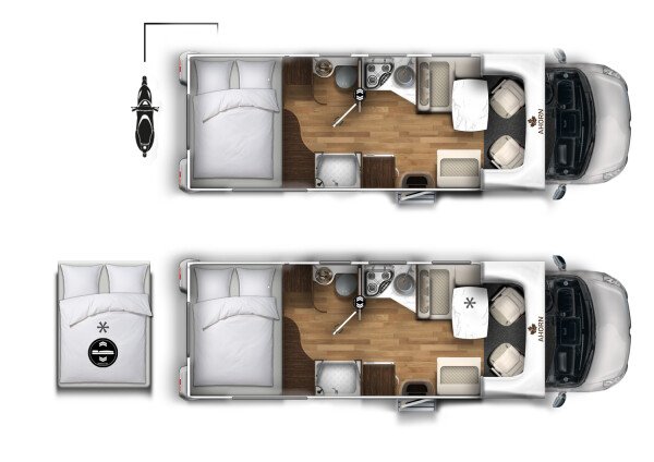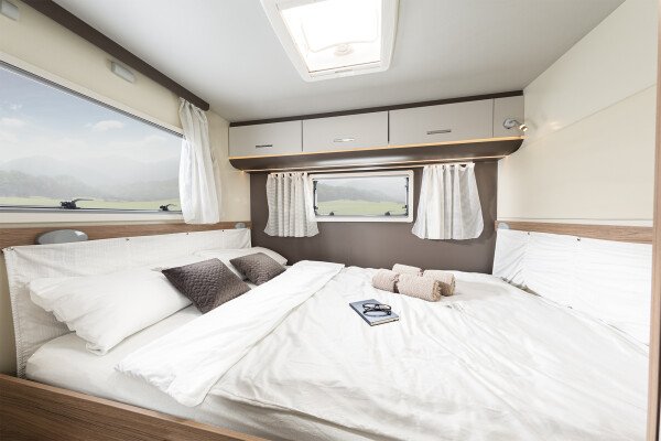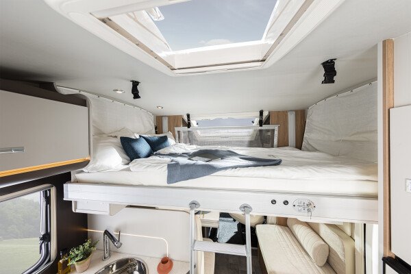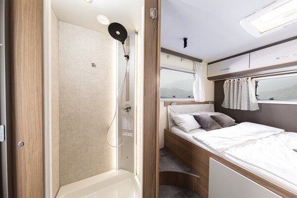 Der Alaska TD bietet angenehmen Schlafkomfort mit einem großen Doppelbett im Heck. Das erhöht montierte Bett ermöglicht den Einbau einer großen Garage, in der auch Motorroller Platz finden. Optional lässt sich auch ein niedriger Betteinstieg kombiniert mit einer kleineren Garage realisieren. Auch der durch eine Schiebetür getrennte Heckbereich ist optimal designet. Dank der integrierten LED-Beleuchtung und dem extra großen Duschkopf genießen Sie den Komfort einer stilvollen, wie funktional durchdachten Badezimmereinrichtung. Die Küchen der Serie verfügen über eine elektrische Dunstabzugshaube, einen Spritzschutz und große Schubladen, die genügend Platz für Ihre Küchenutensilien bieten. Der Esstisch kann nach Belieben ausgeklappt werden und bietet 5 Personen höchsten Esskomfort.