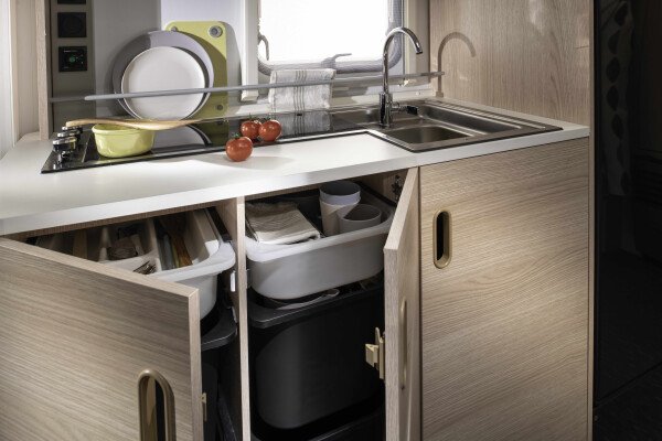 Der Wohnwagen hat eine moderne und stilvolle Innenausstattung, die aus hellem Holz besteht. Das Interieur ist sehr geräumig und bietet viele Stau- und Aufbewahrungsmöglichkeiten. Der Wohnbereich ist mit einer Sitzgruppe ausgestattet, die bei Bedarf zu einem weiteren Schlafplatz umgebaut werden kann.
