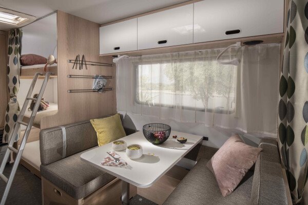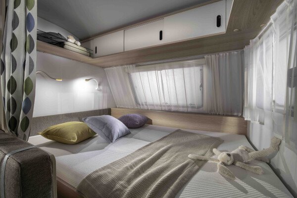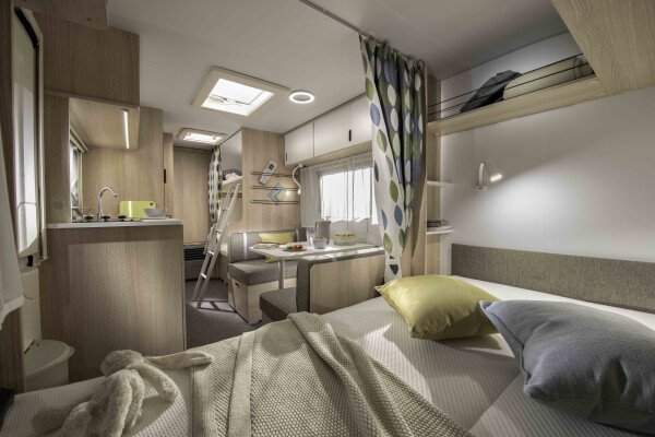 Die Schlafbereiche sind durch Vorhänge vom Wohnbereich getrennt und bieten ein Doppelbett für zwei Erwachsene und drei Stockbetten für Kinder. Der Wohnwagen verfügt außerdem über viele Fenster und Dachluken, die für ausreichend Licht und Belüftung sorgen. Dank des integrierten Movers (Rangierhilfe) kann der Anhänger bequem bewegt und positioniert werden.