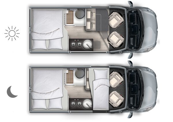 Mit gerade mal mit 5,57 m Länge ist der Van 550 ein kompakter Kastenwagen, der den längeren Modellen in seiner Ausstattung in nichts nachsteht. Der Grundriss ist klassisch: Ein Heckdoppelbett und drehbare Fahrerhaussitze, die zu einer vollwertigen Sitzgruppe führen. Durch seinen raffinierten Ausbau verfügt er über genügend Stauraum. Ein dritter Schlafplatz ergibt sich durch den Umbau der Dinette. Die Küchenzeile verfügt über einen Zweiflammkocher, ein Edelstahlspülbecken und einen geräumigen 90 Liter Kompressorkühlschrank. Sowohl an der Küchenzeile als auch am Esstisch ist eine ausklappbare zusätzliche Abstellfläche angebracht. Das Bad ist mit einer Thetford C 223 Toilette, einer Dusche und einem Waschbecken ausgestattet. Der Frischwassertank wie auch der Abwassertank fassen 100 Liter.
