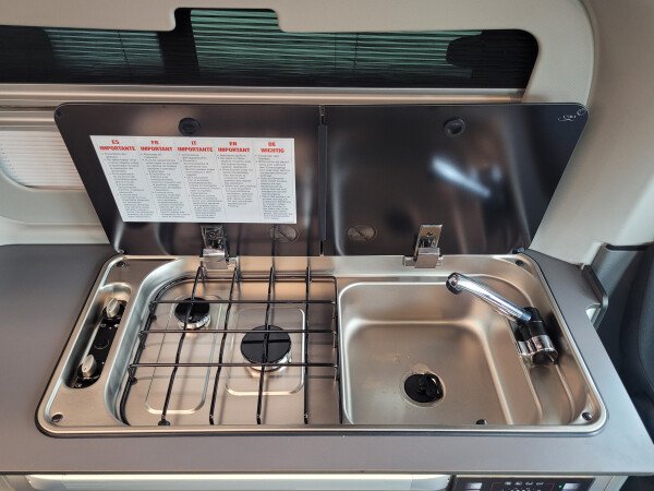 - Küchenzeile mit 2 flammigem Gasherd, Kühlschrank 230V/12V und Spülbecken