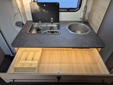 - Küchenzeile mit 2 flammigem Gasherd, Kühlschrank 230V/12V und Spülbecken