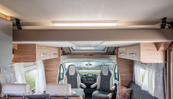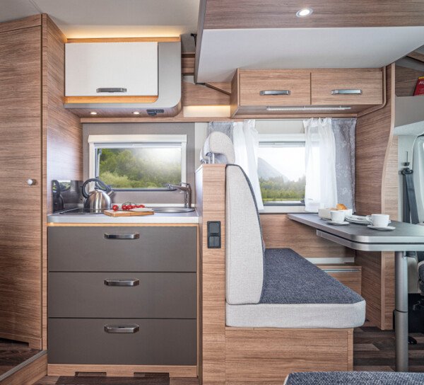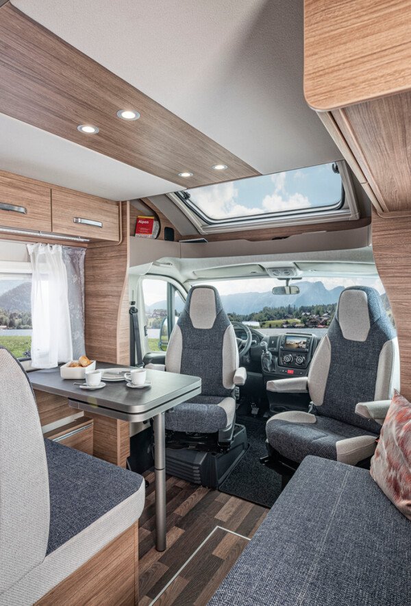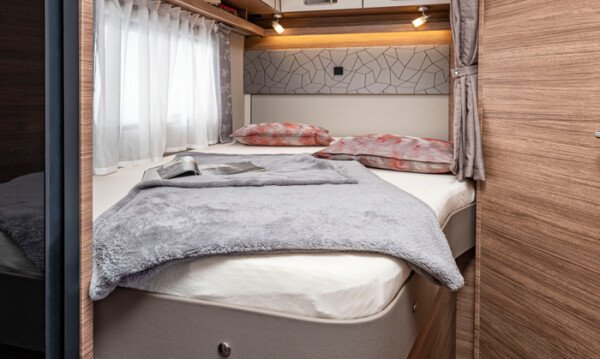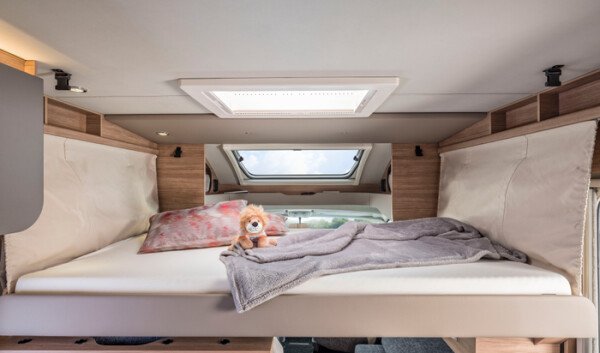 Viel Bewegungsfreiheit für Groß und Klein: Seine hohe Box bringt dem CaraSuite smehr Fahrzeug- und Stehhöhe, was den Innenraum besonders großzügig erscheinen lässt. Untertags ist das serienmäßige Hubbett sicher verstaut, abends flugs hervorgezaubert, um kuscheligen Schlafkomfort zu garantieren.